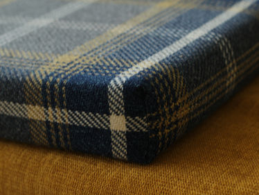 The upholstery plaid fabric in dark blue, gray, mustard, and off white would be best suited for a cozy and rustic interior. It can complement a color palette that includes warm earthy tones such as mustard, honey, brown, tan, and green, or even a more neutral palette with shades of beige and cream.